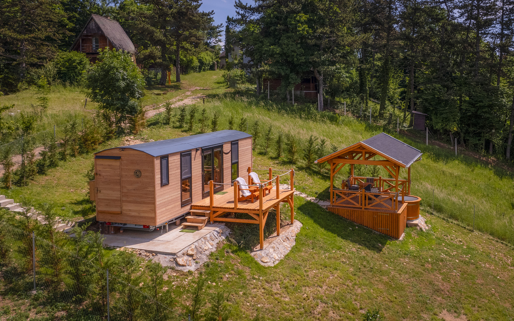 20 nm-es miniház extrákkal: elektromos, folyamatosan fűtött dézsa, ahonnan a csillagokat is nézheted. Hintaágy, ahonnan belefeledkezhetsz a látványba. „Lebegő” terasz fa adirondack fotelekkel és asztalkával, ahol a reggeli kávédat/teádat kortyolgathatod. Mindezt zavartalan, 180 fokos panorámával.
